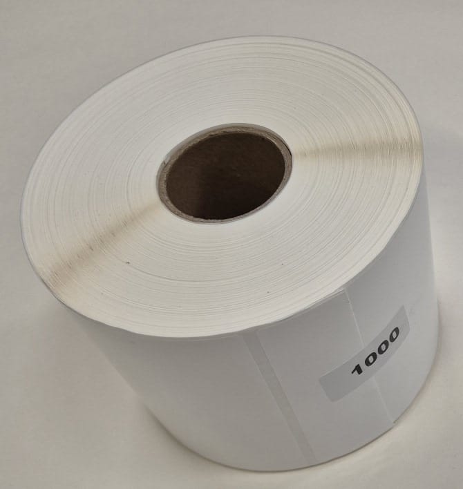 Direkt Termo vit rund plastetikett PP, Permannent starkt lim, Bredd=90mm, Längd=90mm, Kärna C=Ø40mm, 1500st/rulle, OD=190mm